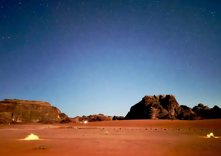Dormir à la belle étoile dans le Wadi Rum est une expérience magique. Sans pollution lumineuse, le ciel nocturne se révèle dans toute sa splendeur, offrant un spectacle éblouissant d'étoiles et de voies lactées. S'endormir en écoutant les doux bruits du désert et se réveiller avec l'aube est une manière unique de se connecter avec la nature.